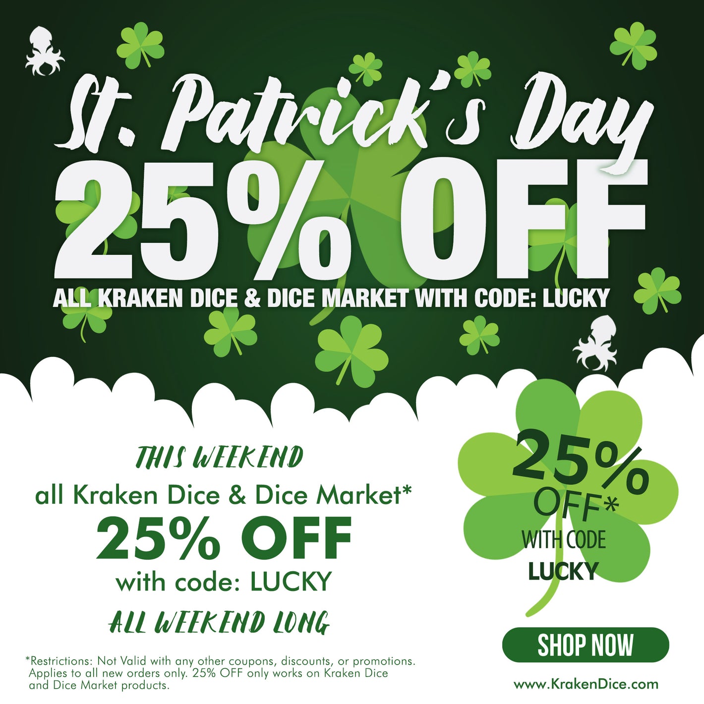 Get 25% off all Kraken Dice & Dice Market Products. USE code: LUCKY