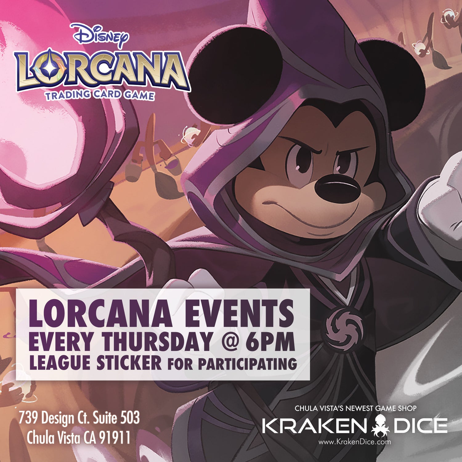LORCANA @ the Kraken Dice Headquarters. Every Thursday @ 6pm. League Sticker for participating. Check out our calendar above for more details.