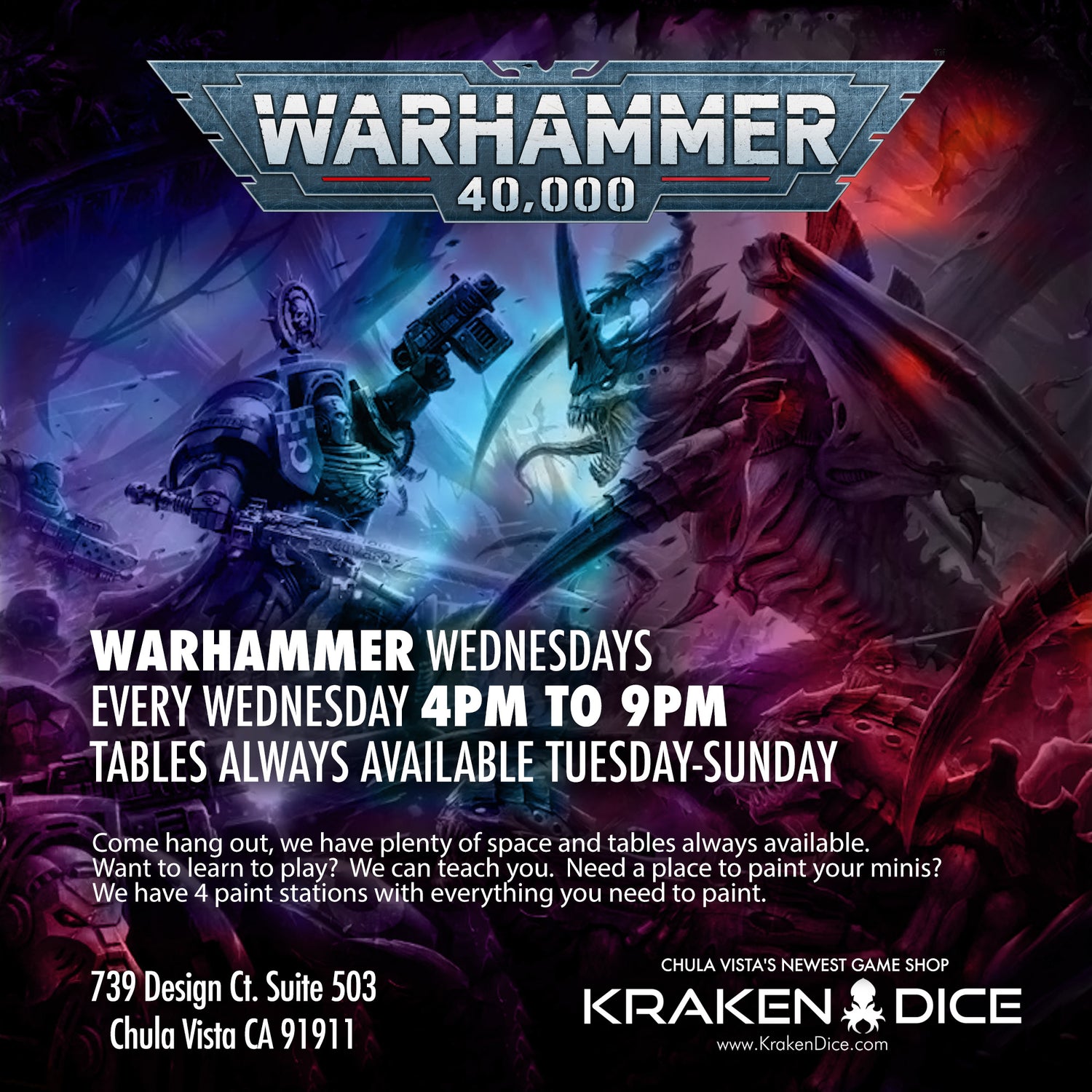 Come hang out at Kraken Dice Headquarters, we have plenty of space and tables always available. Want to learn to play Warhammer? We can teach you.