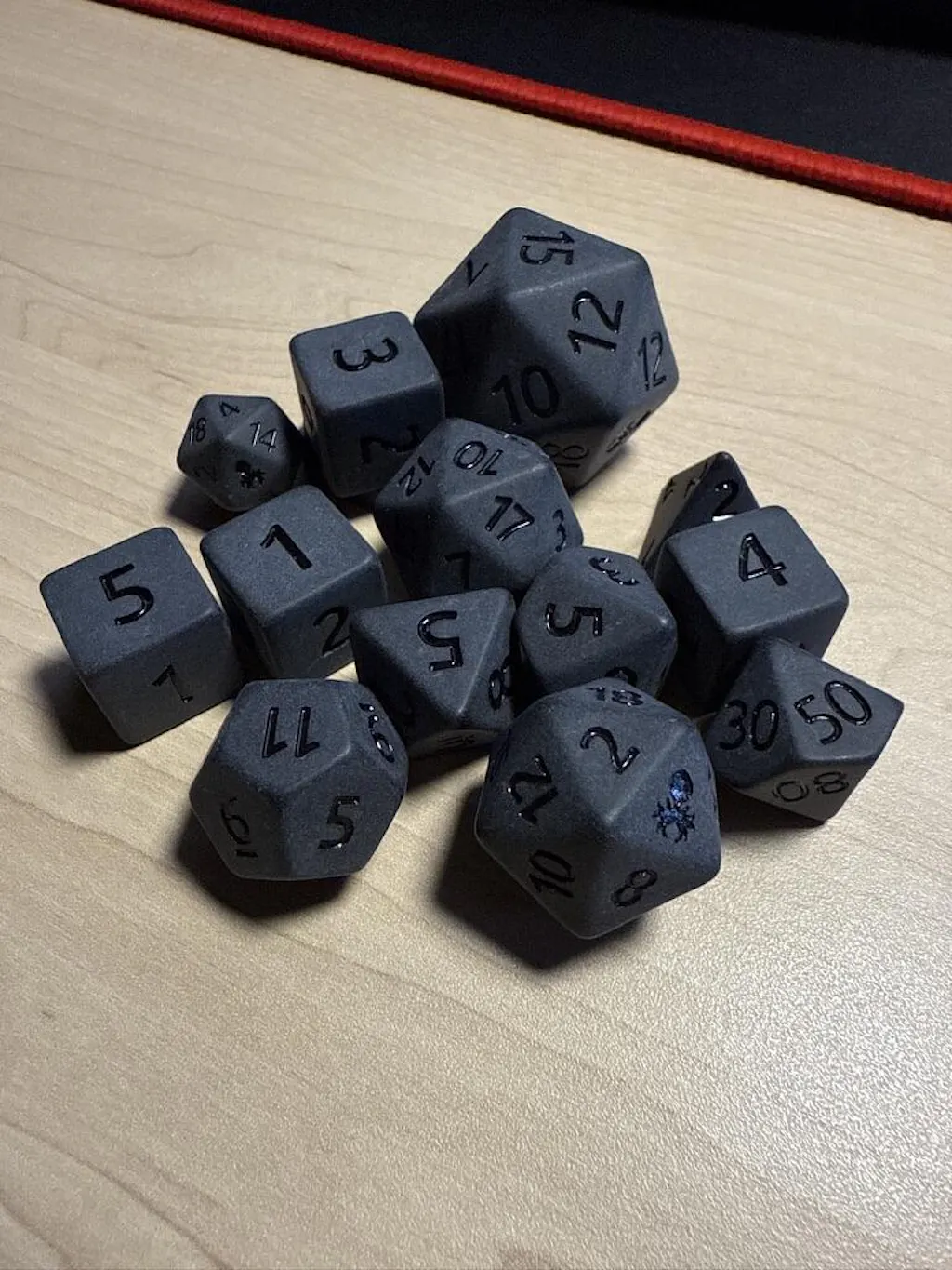 *Sara's Dice are matte black not gray, with use and the natural oils from your hands the dice will turn into a matte black finish.