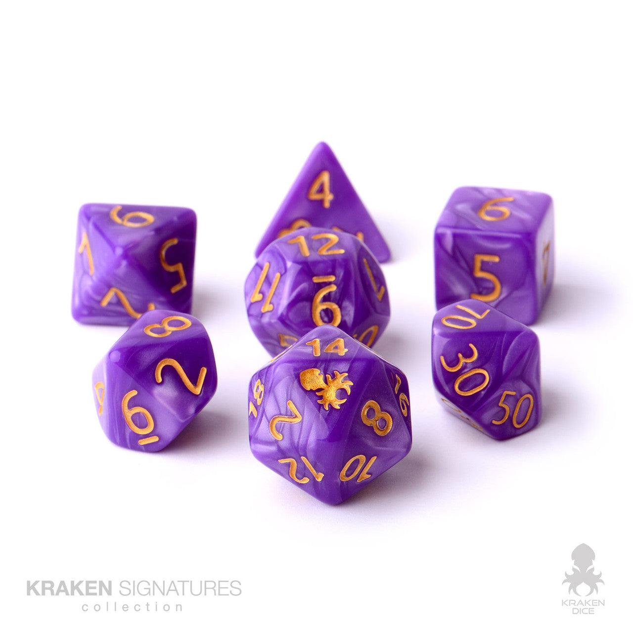 Kraken Signature's 7pc Purple with Gold Ink Polyhedral RPG Dice Set