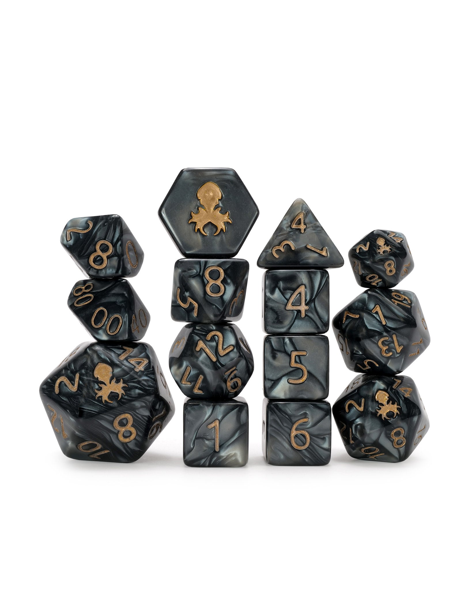 Kraken's Signature Black 14pc Dice Set inked in Gold