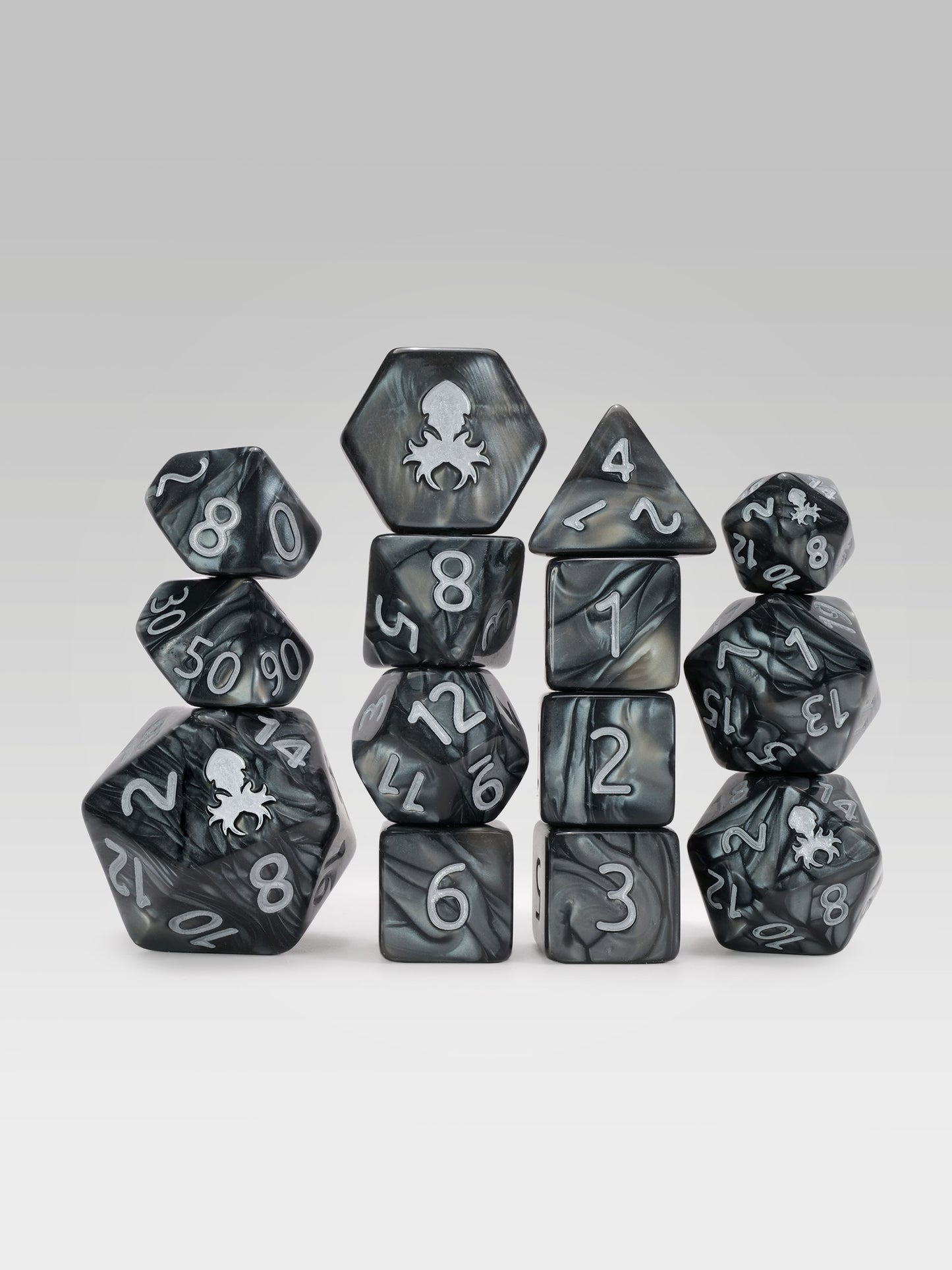 Kraken's Signature Black 14pc Dice Set inked in Silver