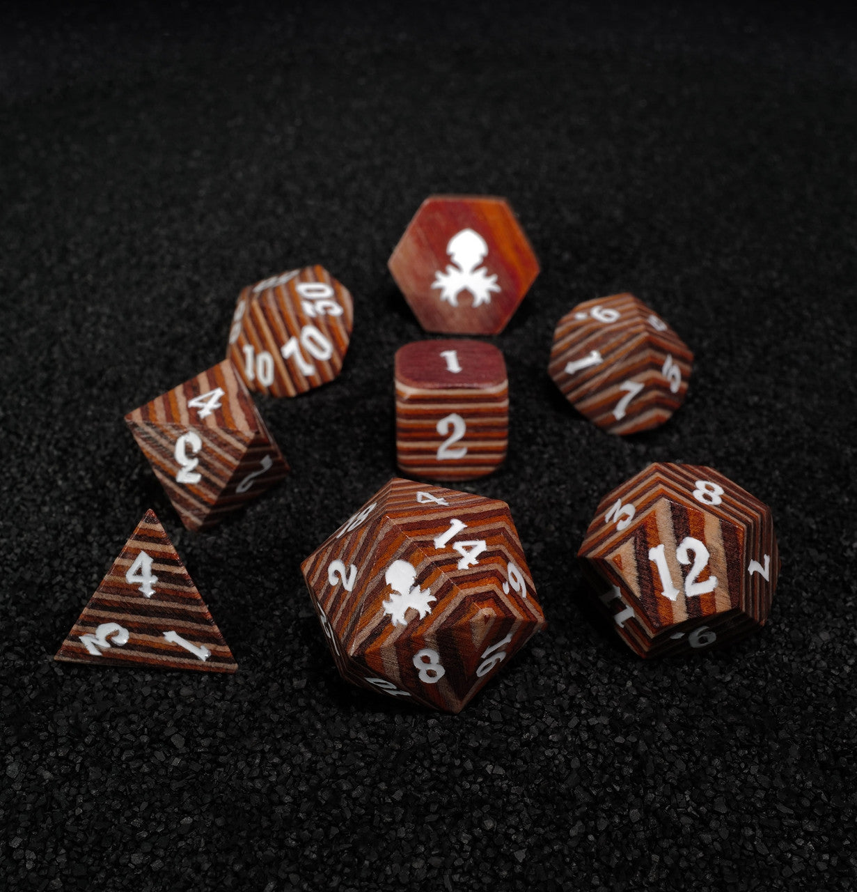 Kraken Dice 8pc Dice Sets are made from Technical Wood, which is created by a high-pressure steaming process of natural tropical hardwoods. This process creates a beautiful, lightweight, and resilient wood that will make these dice sets a great addition to any gaming table.