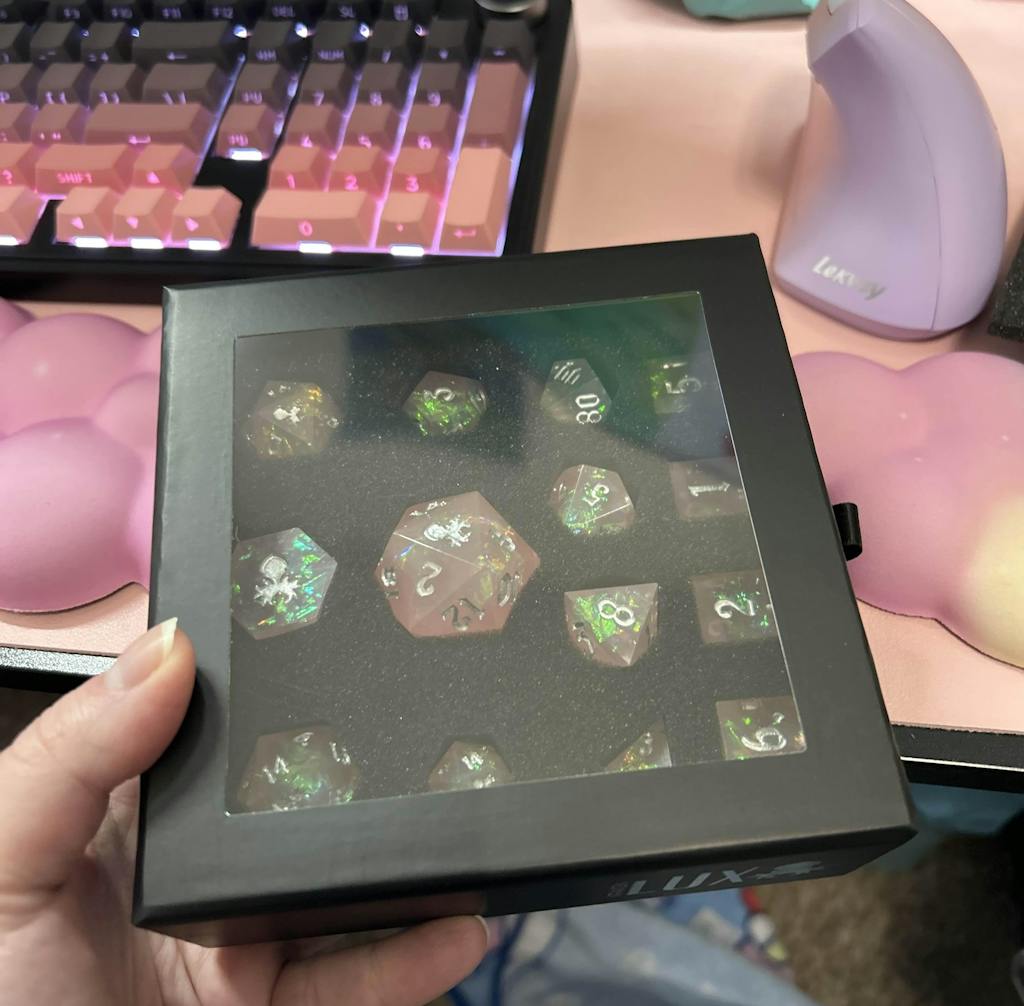 I honestly was really disappointed with this set of dice :< I spent 150$ total approx on Kraken dice with my order, and the Persephone's Giggles dice were the reason I decided to spend on Kraken dice in the first place, as compared to a different dice maker, because I really loved the design of this set, namely the way the photos of the dice make them look super reflective and brilliant under lighting, with streaks of greenish/white. However, the dice I got (namely the largest D20 in the set) didn't really look that way, it's mostly pinkish/murky with only one small facet that really has that reflective effect, and a bunch of the other ones also kind of were like that. Nevertheless, the corners/polishing on it was still nice, i still just did feel kind of bummed out since it was such an expensive set.