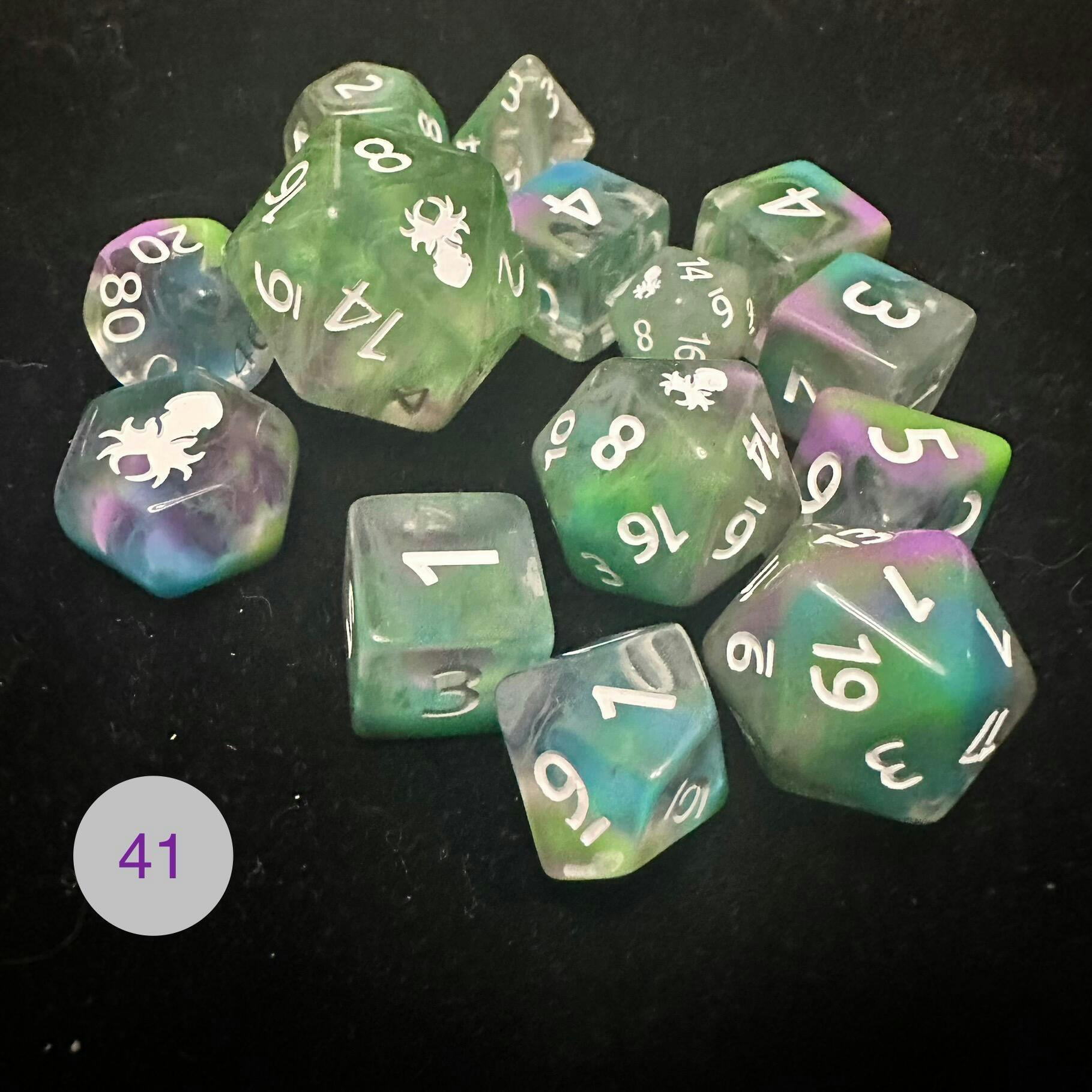 From the unseen depths, a whisper calls, carrying echoes of ancient tides and forgotten lore. The WATER NYMPH dice set by Kraken Dice has indeed surfaced, born of premium resin and infused with an alluring mystery. Observe the vibrant dance of purple, green, and blue within, swirling like the veins of a living ocean, pulsating with twilight luminescence and the secrets of the deep. What truths lie hidden within these enigmatic polyhedrals? Each roll is a delve into uncharted waters, a chance to unfurl the secrets of your next grand adventure. Let the WATER NYMPH set guide your destiny, revealing magic from the heart of the waters' enigma.